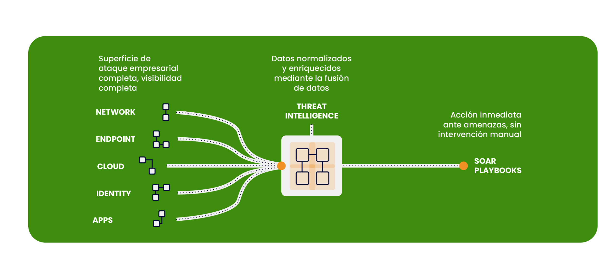 Además, normaliza todos los datos recopilados y automatiza procesos mediante playbooks predefinidos, lo que le brinda a su equipo una nueva forma de visualizar, gestionar y fortalecer su postura de ciberseguridad.